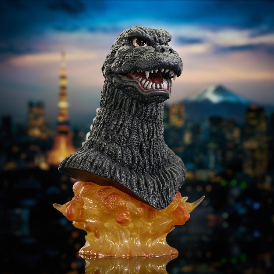 A Diamond Select Toys release! From the fires of a nuclear explosion rises Godzilla! The irradiated monster takes on his 1974 appearance in this approximately 9.5-inch resin bust, set atop a pedestal base designed to resemble a tower of flames. Limited to only 1000 pieces, it comes packaged with a numbered base and a numbered certificate of authenticity in a numbered full-color box. Designed by Joe Allard, sculpted by Rocco Tartamella! SRP: $200.00