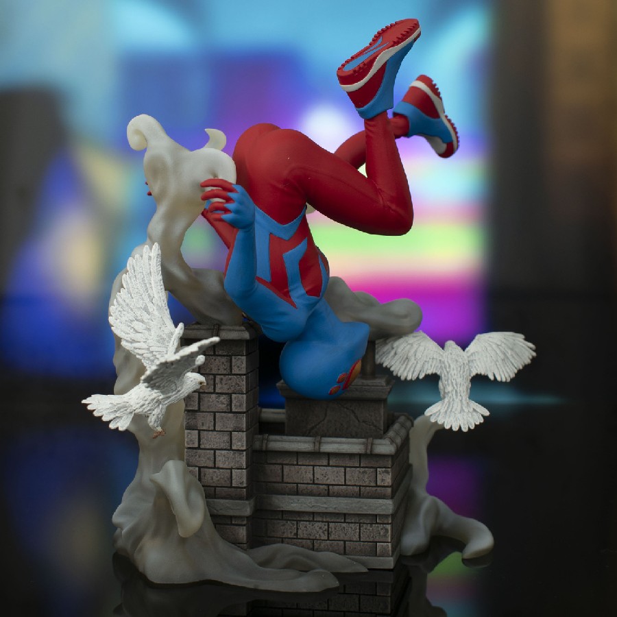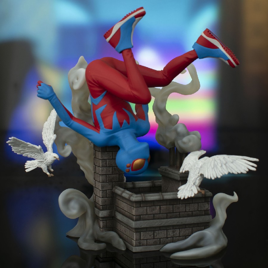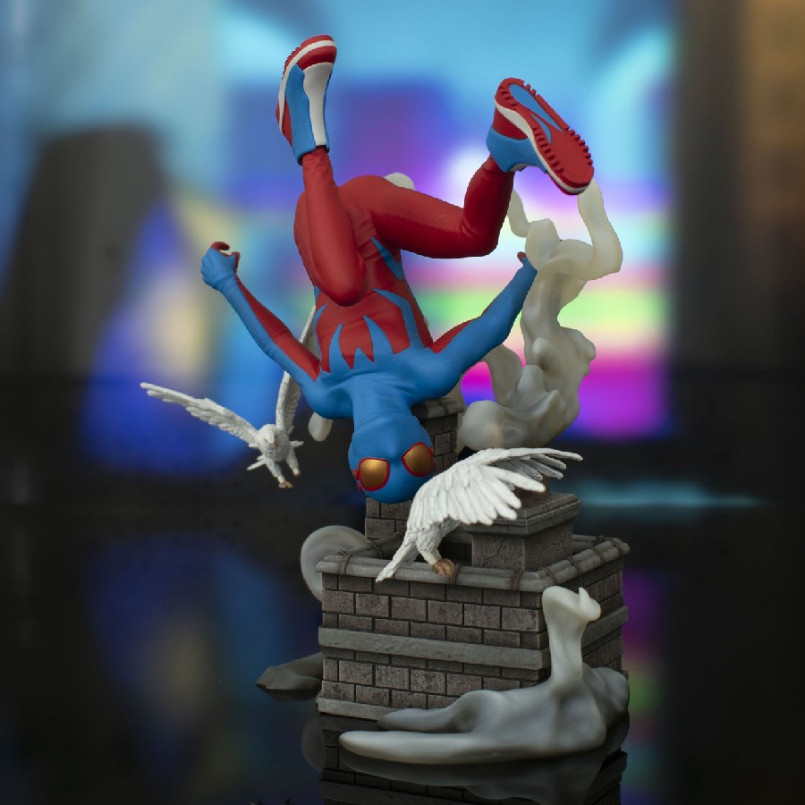 A Diamond Select Toys release! The boy is back in town! Young hero Spider-Boy flips over a New York City rooftop in this all-new Gallery Diorama from DST! Surrounded by flapping pigeons and posed heels over head, Spider-Boy measures approximately 8 inches tall and is made of high-quality PVC. This statue features detailed sculpting and paint applications and comes packaged in a full-color window box. Designed by Nelson X. Asencio, sculpted by Alterton! SRP: $59.99
