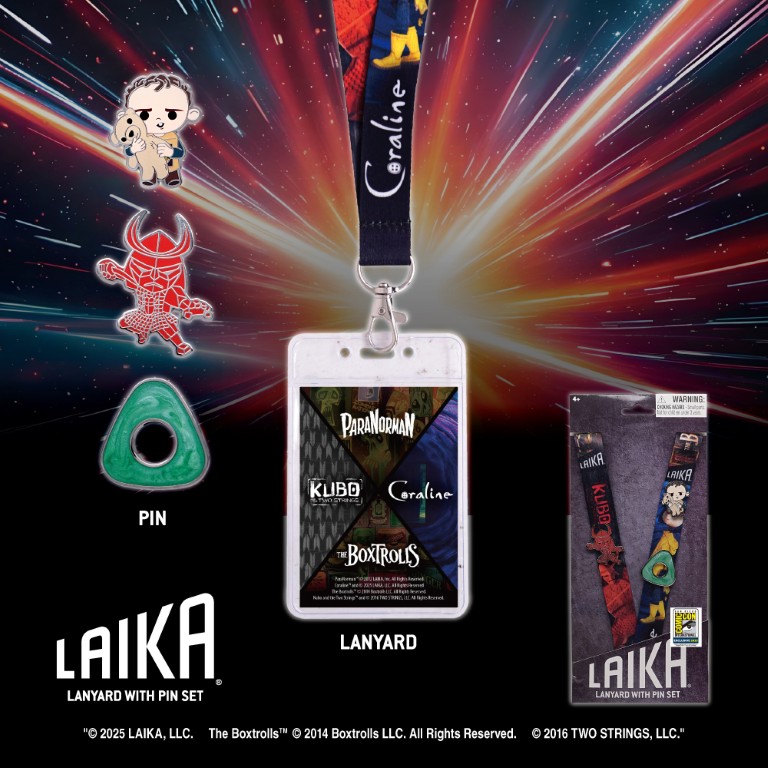 Step into the enchanting world of stop-motion storytelling with Monogram’s Laika Lanyard & Pins Set – an exclusive debuting at San Diego Comic-Con 2025! This collectible set includes a lanyard featuring iconic artwork from Coraline, ParaNorman, Kubo and the Two Strings, and The Boxtrolls — plus three enamel pins celebrating beloved Laika details: Coraline’s Looking Stone, Eggs’ Teddy Bear from The Boxtrolls, and Kubo’s Origami Animals.
