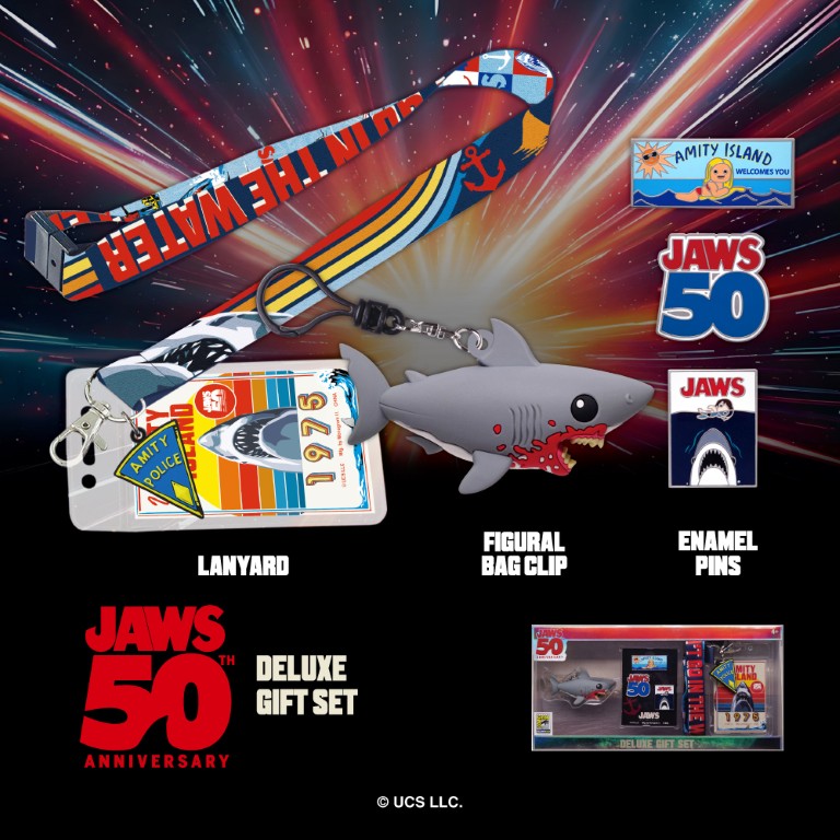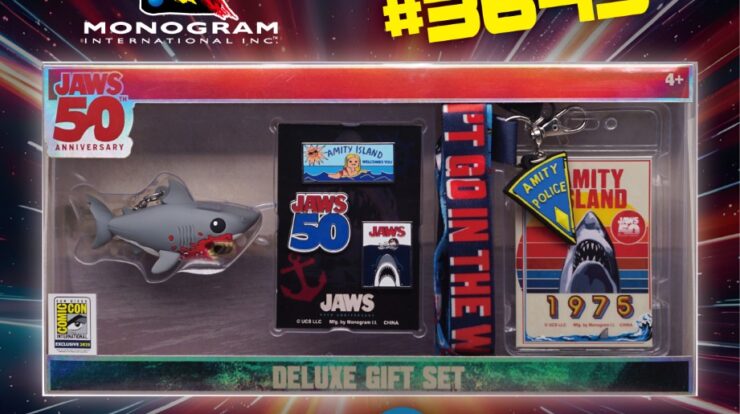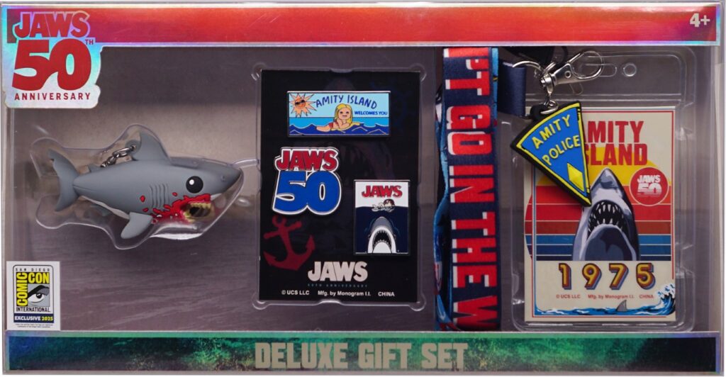 Celebrate five decades of deep-sea suspense with Monogram’s Jaws 50th Anniversary Deluxe Gift Set – a chilling collectible debuting at San Diego Comic-Con 2025! This exclusive set includes a bloodthirsty Bruce the Shark 3D Foam Bag Clip, a themed lanyard featuring a red and blue checkerboard design with Bruce, anchors, and “Jaws” iconography, plus three enamel pins: the legendary Jaws movie poster, Amity Island signage, and the official 50th Anniversary logo.
