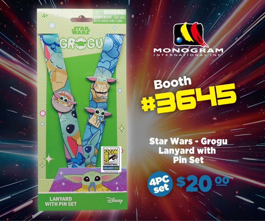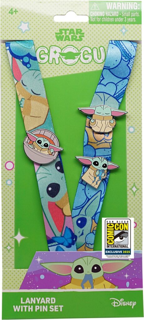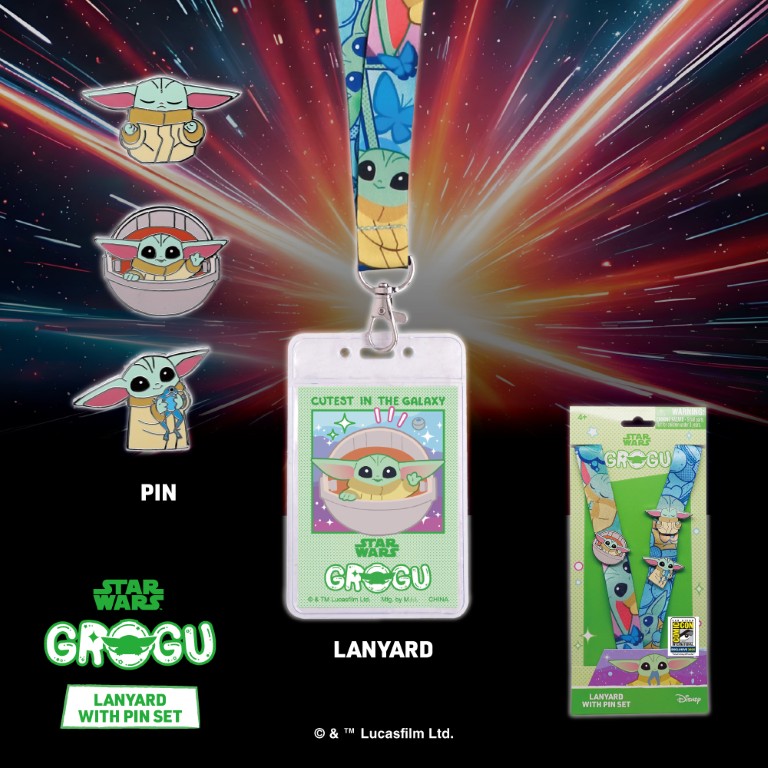 Celebrate the galaxy’s most adorable Force-wielder with Monogram’s Grogu Lanyard and Pins Set – debuting exclusively at San Diego Comic-Con 2025! This collectible set includes a lanyard featuring Grogu in multiple adorable poses, plus three enamel pins: Grogu using the Force, Grogu in his hovering pod, and Grogu munching on his favorite frog snack.