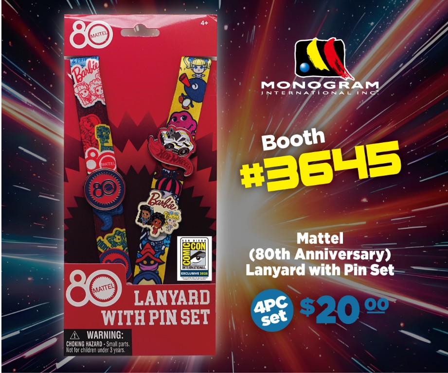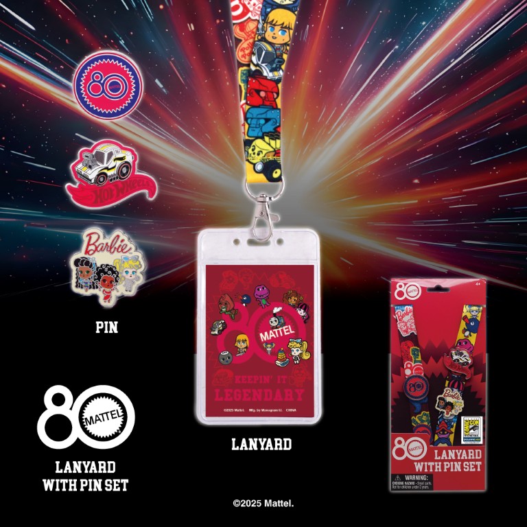 Get ready to celebrate 80 years of iconic toys with Monogram’s Mattel 80th Anniversary Lanyard & Pins Set – a nostalgic exclusive debuting at San Diego Comic-Con 2025! Created in collaboration with Mattel, this colorful collectible honors beloved brands like Barbie, Hot Wheels, and Monster High with a lanyard design that proudly features the 80th anniversary logo and iconic imagery. The set also includes three enamel pins: the official 80th Anniversary emblem, a Hot Wheels logo, and a Barbie silhouette – capturing the spirit of Mattel’s legendary lineup. Whether you’re a collector or just celebrating the classics, this set is the ultimate accessory.