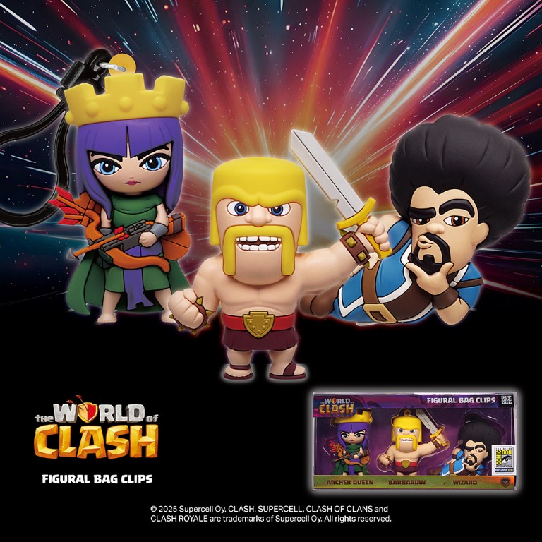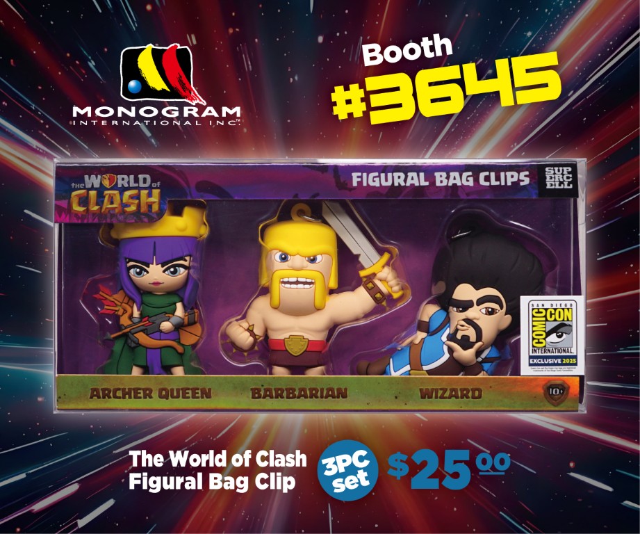 Prepare for battle at San Diego Comic-Con 2025 with Monogram’s Clash of Clans 3D Foam Bag Clip Set – an exclusive collectible in collaboration with World of Clash! This powerful set includes three fan-favorite characters in Monogram’s signature 3D foam style: the fearless Barbarian, the magical Wizard, and the commanding Archer Queen.