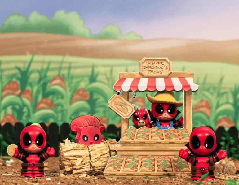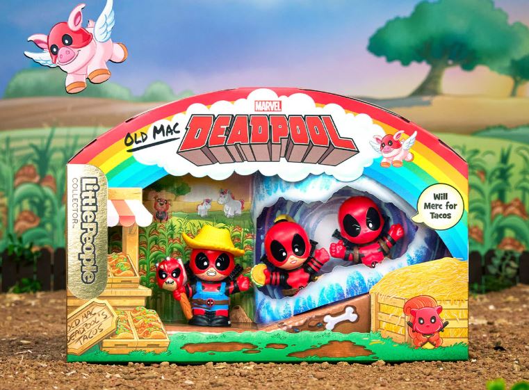 Deadpool and Lady Deadpool love tacos so much, they traveled the multiverse to find Old MacDeadpool and his taco farm! This character, with Headpool on his pitchfork in our Little People Collector set, welcomes his alternate selves arriving by portal to this very tasty world.