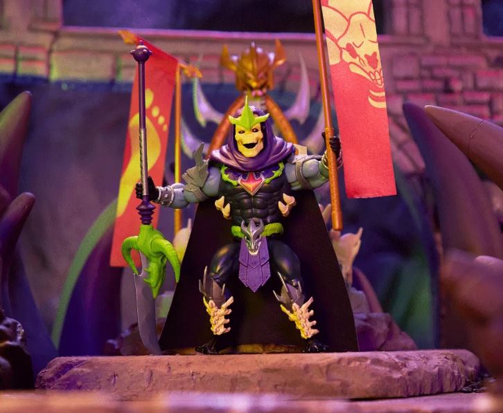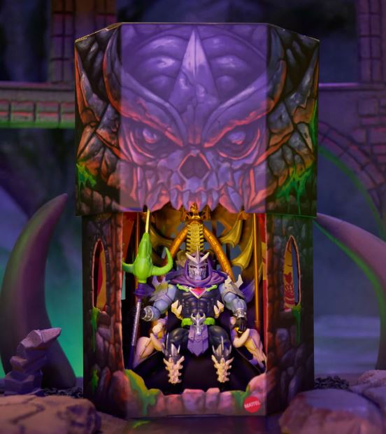 Meet the ultimate embodiment of evil, if you dare! A bone-chilling hybrid of Skeletor and Shredder, our battle-ready Turtles of Grayskull Skele-Shredder figure features 16 points of articulation. Plus, the three swappable heads capture different stages of his terrifying transformation.